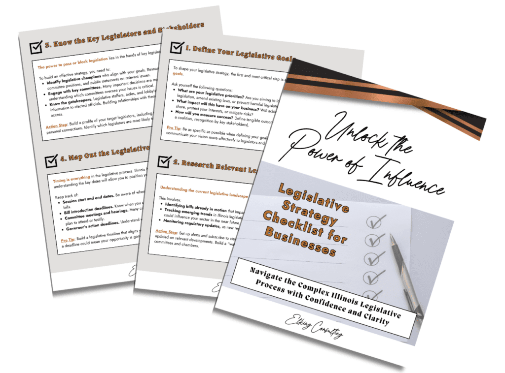 The legislative process can feel overwhelming, but with the right strategy in place, your business can effectively influence Illinois politics. Our Legislative Strategy Checklist for Businesses provides a step-by-step guide to help you gain the legislative edge and achieve your goals.